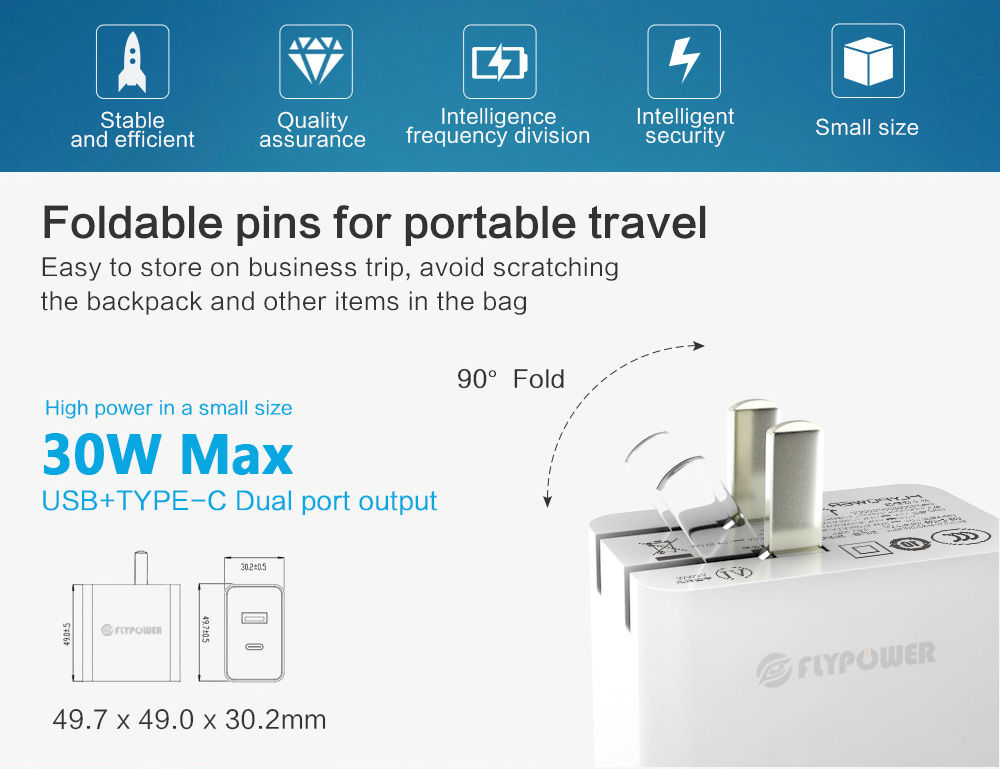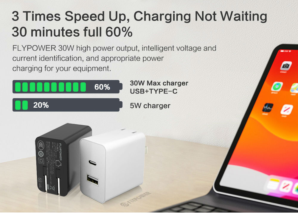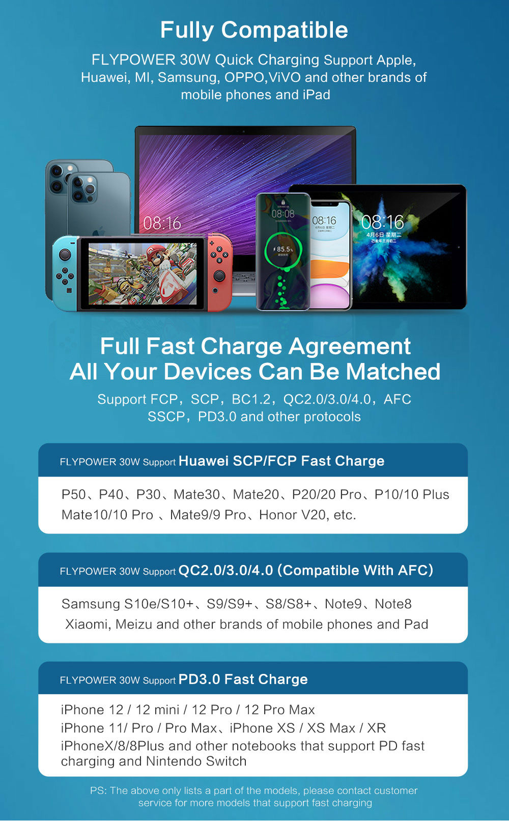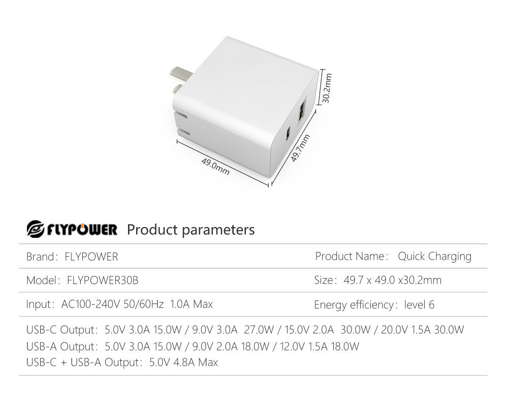 The Feitianying PS30B fast charging charger supports smartphones and tablets from brands such as Apple, Huawei, Xiaomi, Samsung, OPPO, and VIVO