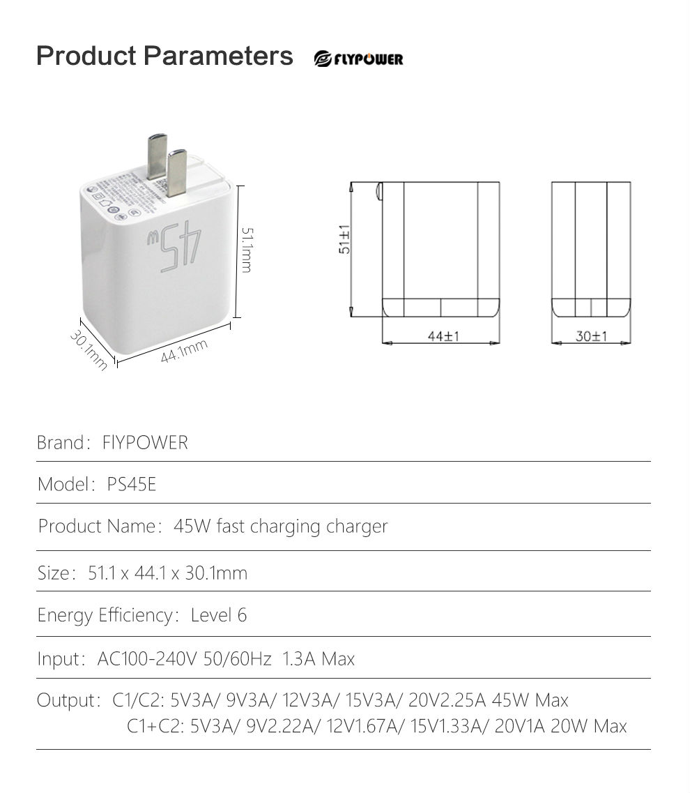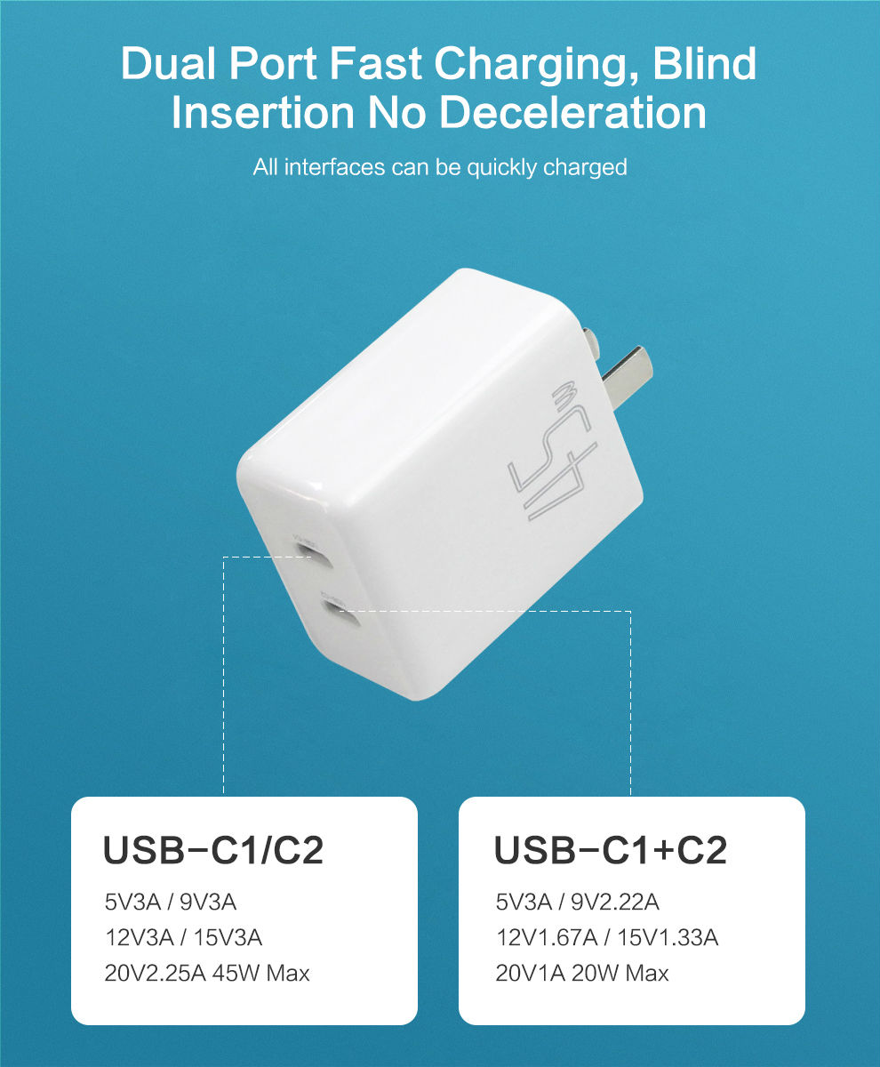 Type output:C1/C2: 5V3A/ 9V3A/ 12V3A/ 15V3A/ 20V2.25A 45W Max