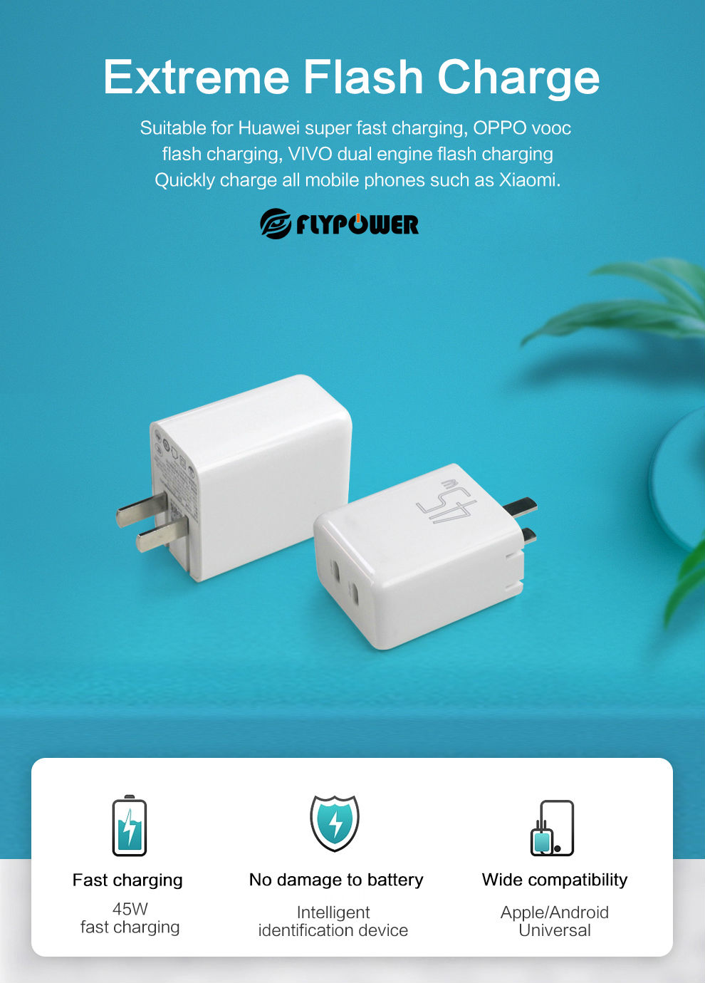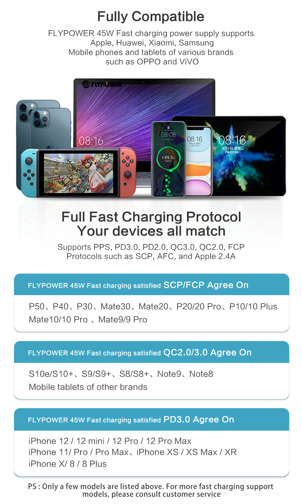 Feitianying 45W Gallium Nitride Charger supports various brands of phones and tablets such as Apple, Huawei, Xiaomi, Samsung, OPPO, VIVO, etc