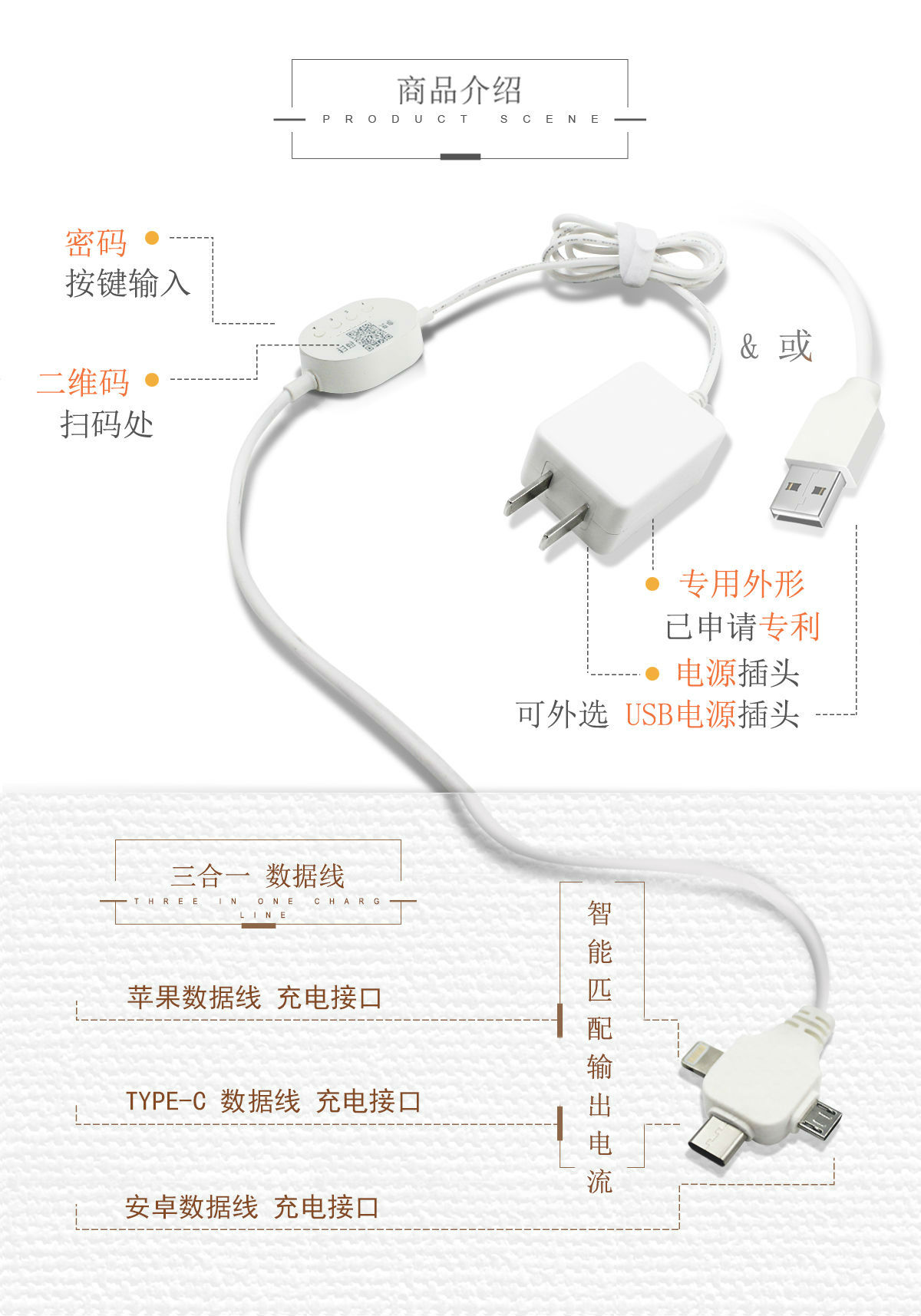 飞天鹰扫码共享充电线(USB版)专门针对网吧场景量身打造,电源头采用USB接口,可以直接插在电脑接口上使用;充电接口有TYPE-C、安卓、苹果三个接口,可以适用市面上所有的手机;微信扫码支付——输入密码充电,使用简单方便;另外还有押金版和面押金版两种模式选择,收费金额可以自由设置。