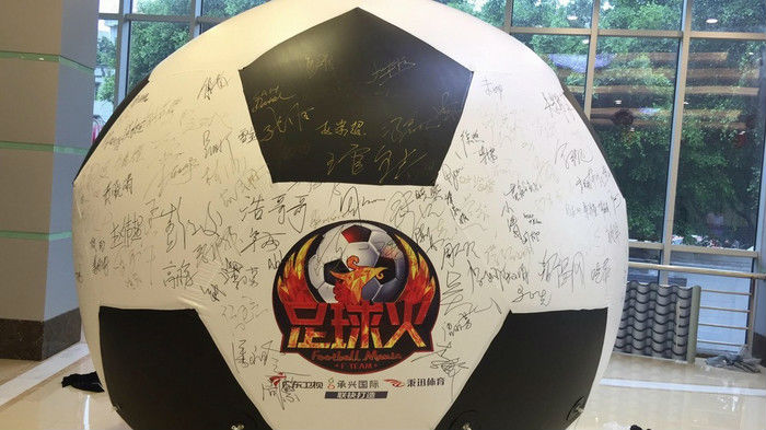 签到现场伫立的3米多高的巨型足球,所有抵达的嘉宾都在上面签名留念
