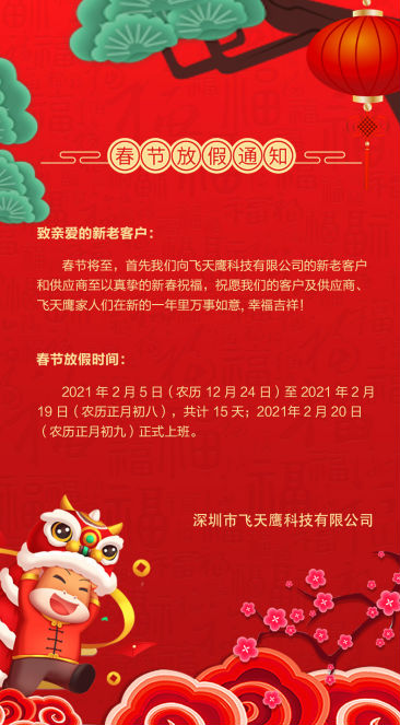2021年2月5日(农历12月24日)至2021年2月19日(农历正月初八),共计15天;2021年2月20日(农历正月初九)正式上班。