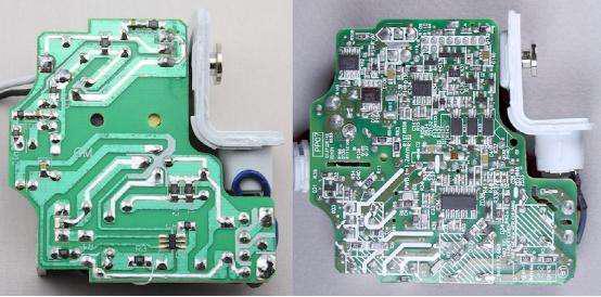 拆开以后你会发现正品充电器里面元器件多,料很足,而山寨充电器由于少了很多东西,则显得有点空。正品充电器里面有围起保护电路,灌胶,提高散热性和绝缘性,安装散热片。而山寨充电器则没有这些保护措施。因为没有做电路保护设计,山寨充电器元器件功率较小,电路板较薄,没有灌胶。