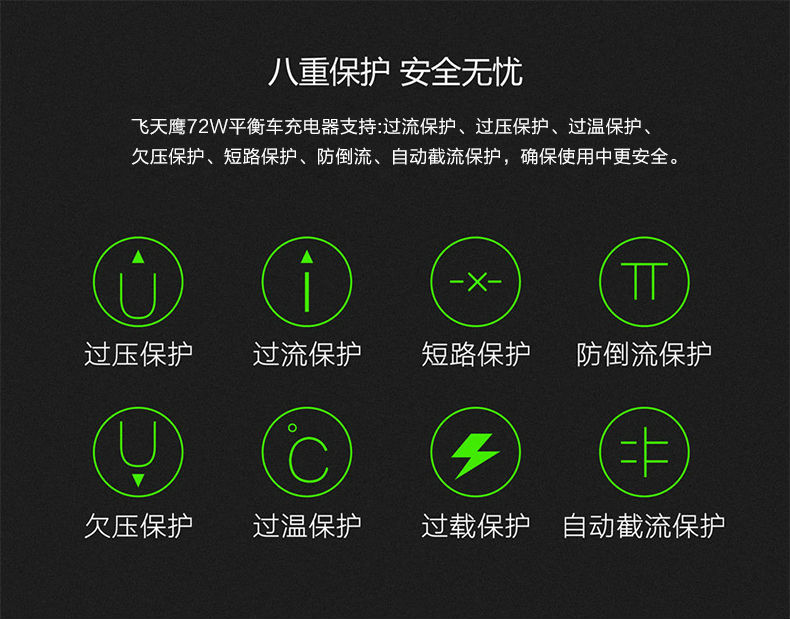 四重安全保护:过流保护 短路保护 反接保护 过压保护。
