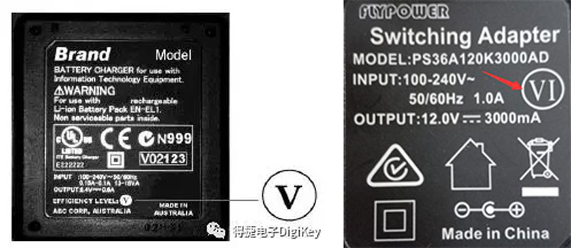 我们可以看下两张对比图,图一的V代表的就是五级能效,图二的 Ⅵ 代表的则是六级能效。六级能效也是目前最高的能效标准,代表着电源适配的效率更高,更节能。