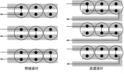 二、电源PCB走线和布局。反馈线路应避开磁性元件、开关管及功率二极管。输出滤波电容放置及走线对纹波噪声至关重要,如图2所示,传统设计中由于到达每个电容的阻抗不一样,所以高频电流在三个电容中分配不均匀,改进设计中可以看出每个回路长度相当即高频电流会均匀分配到每个电容中。