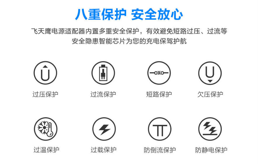 支持过流、过压、过温、过载、欠压、短路、防倒流、防静电 八重电路保护,层层防护,充电安全有保障。