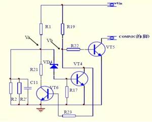 输入电压在正常工作范围内时, Va大于VD4的稳压值,VT4导通,Vb为0电位,VT5截止, 此时保护电路不起作用;当输入电压低于设定欠压值时,Va小于VD4的稳压值,VT4截止,Vb为高电位,VT5导通,将COMP(芯片的1脚)拉到0电位,芯片关闭输出,从而实现了欠压保护功能。 R21、VT6、R23组成欠压关断、恢复时的回差电路。当欠压关断时,VT6导通,将R21与R2并联,